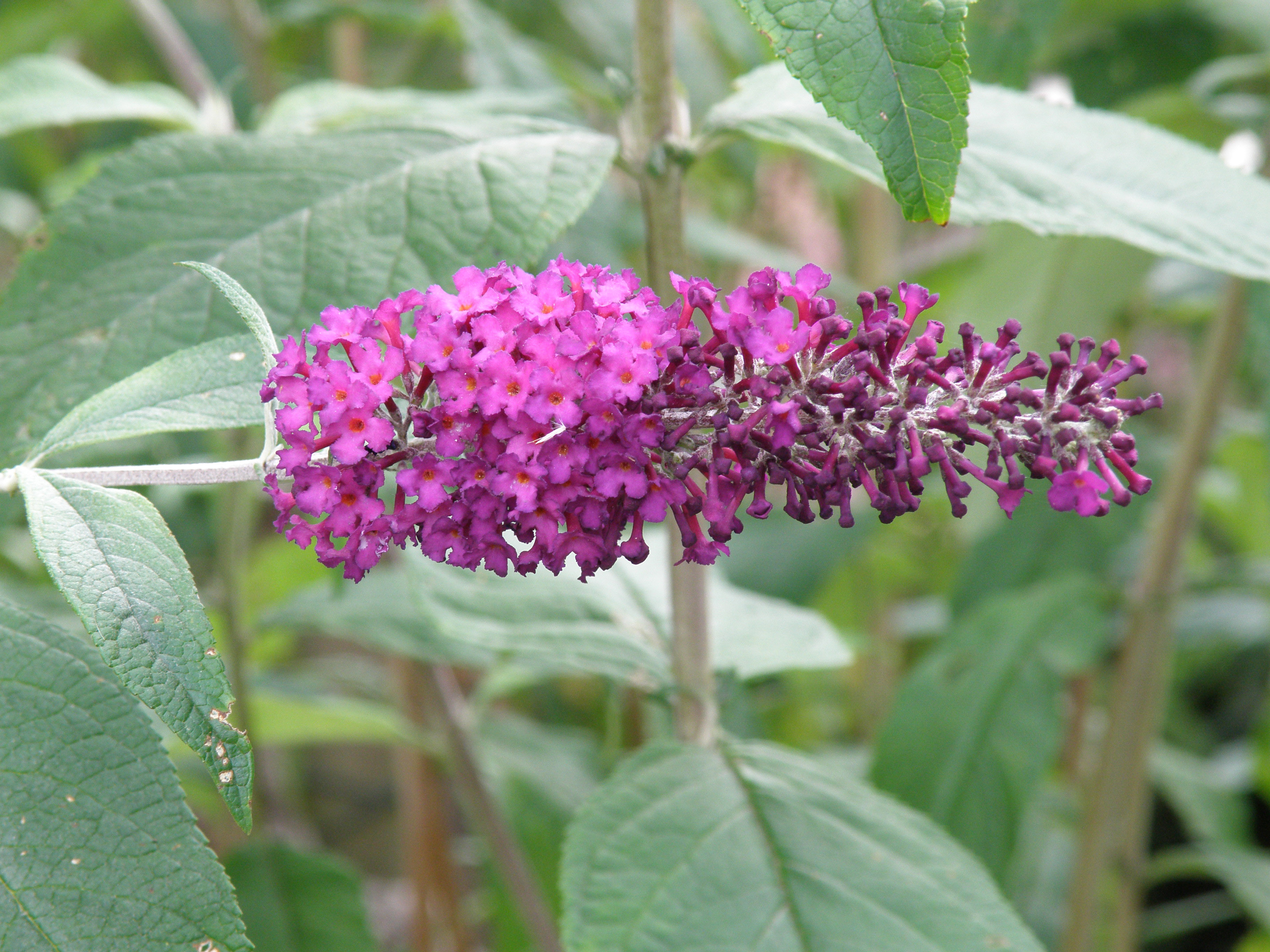 Buddleja davidii Franch.is a popular garden shrub which has escaped cultivation to become established as a naturalised plant in the wild, where it can often be found on waste ground around towns and cities. It will grow happily in most garden soils and can even be seen growing out of cracks in masonry on buildings. It does prefer a sunny position as none of the buddlejas do well in shade. It grows well in even poor soil sending up long arching branches which are topped by the flowers in ranged in a cyme in late summer. Being a late flowering shrub it responds to early spring pruning and when pruned hard in March it produces far more flowers. These flowers give it its common name of butterfly bush as there strong scent is irresistible to butterflies.